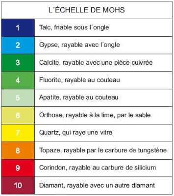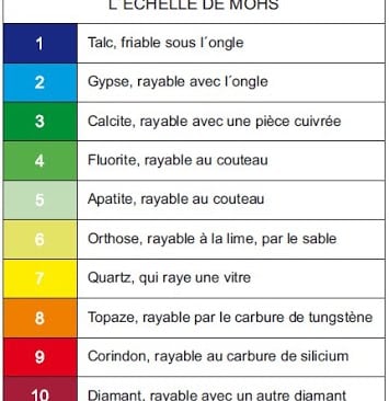 L'échelle de Mohs fut inventée en 1812 par le minéralogiste allemand Friedrich Mohs afin de mesurer la dureté des minéraux. Elle classe les minéraux sur une échelle de 1 (très tendre) à 10 (très dur).